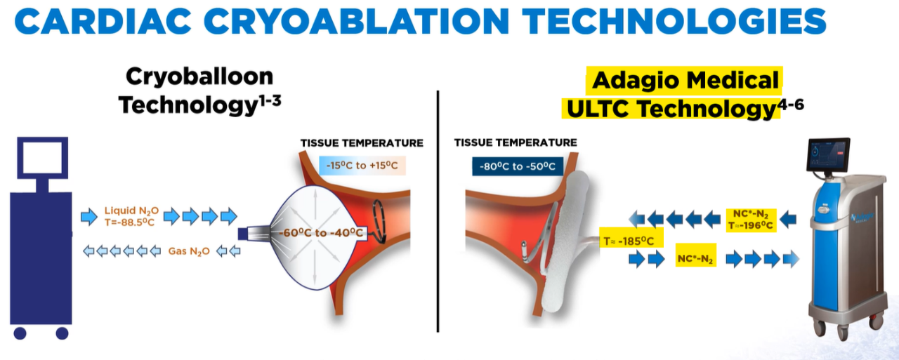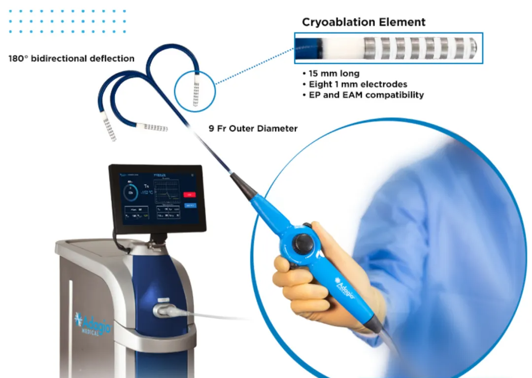 Adagio成立于2011年,總部位于加利福尼亞州,致力于開發(fā)一系列微創(chuàng)冷凍消融技術(shù),用于治療心律失常,包括心房撲動、室性心動過速以及陣發(fā)性和持續(xù)性心房顫動。該技術(shù)通過釋放極寒氣體冷凍和瘢痕化與心臟組織相關(guān)的不規(guī)則電信號。