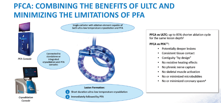 PFCA是Adagio Medical的超低溫冷凍消融(ULTC)和脈沖電場消融(PFA)的獨特組合,共用一根導(dǎo)管,優(yōu)點如下: